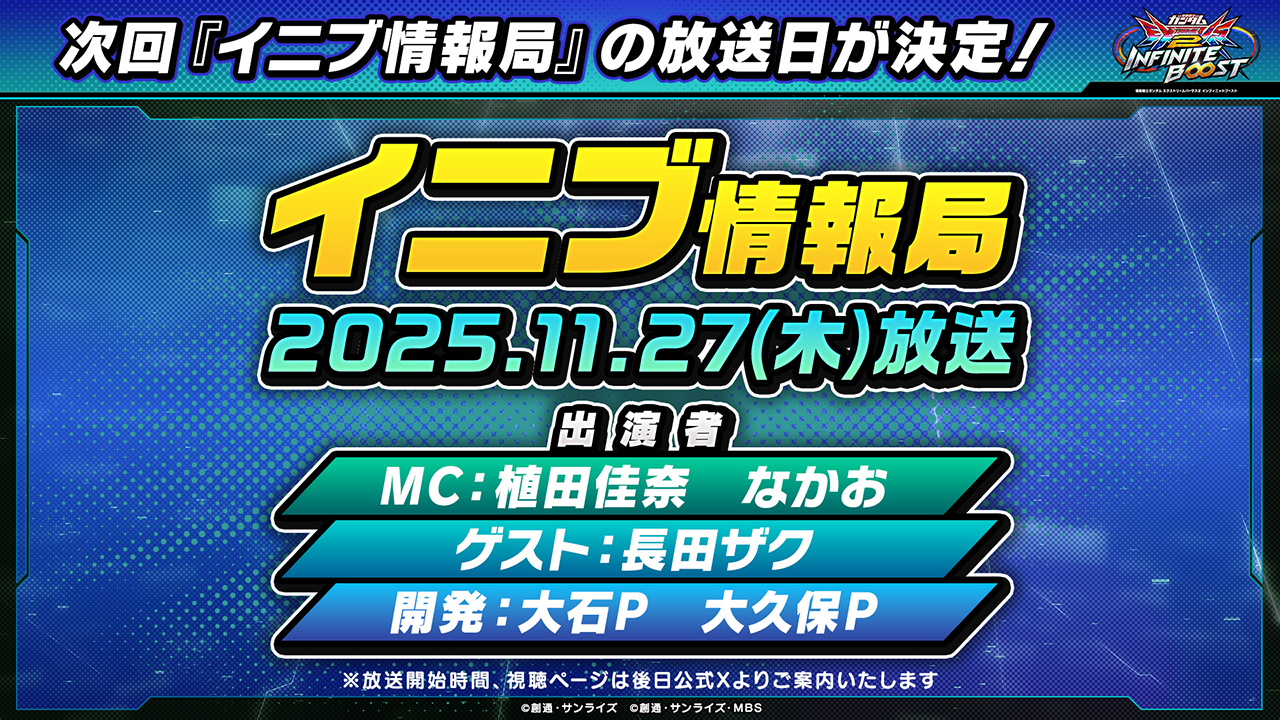 「機動戦士ガンダム エクストリームバーサス2 インフィニットブースト」の公式配信番組『イニブ情報局』の放送日が決定しました!放送開始時間や視聴ページなど詳細は後日、公式X「機動戦士ガンダムEXVS.シリーズ公式」よりご案内いたします。