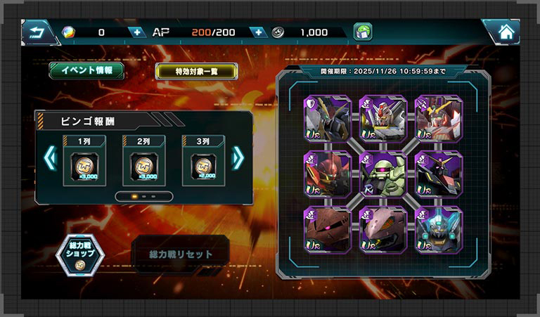 集めた総力戦メダルは「総力戦ショップ」にて総力戦ショップ限定のURキャラピースや、重装ギア、支援ギア、強化プログラムE、ER第3兵装チップ、過去のイベント報酬のMS設計図、キャラピースと交換が可能です。