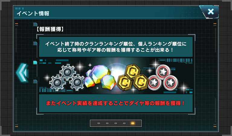 ダイヤをはじめ、上位ランキング達成者の称号、ERボディチップ、強化プログラムE、ハロコイン、URカスタムチケット、クランメダル、汎用ギア、グランドコインなど、豪華報酬を入手可能です。