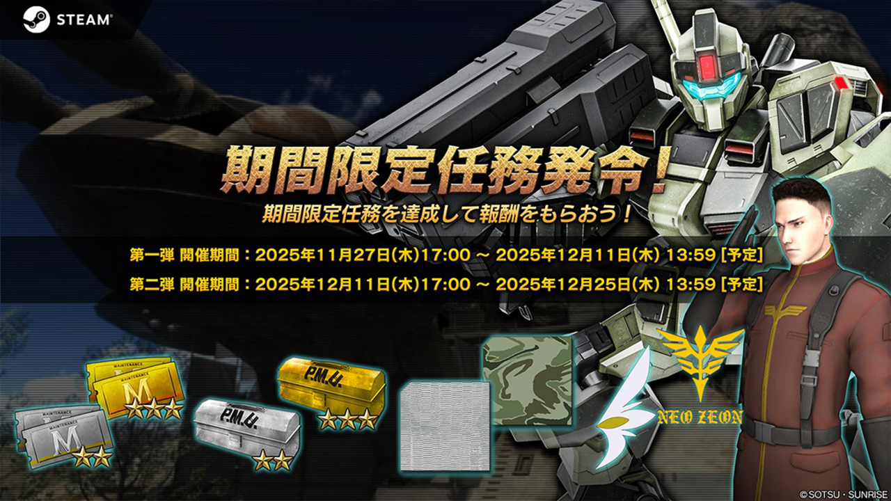 また、開発ビデオレター公開を記念して、PlayStation®版とSteam®版共に、「RX-93ff νガンダムLV1」や「MSN-04FF サザビーLV1」、「ゼク・ツヴァイLV2」などの★4機体からランダムで1機が確定入手できる、1日1回無料の「開発ビデオレター公開記念 MS確定無料抽選配給」を11月27日(木)まで実施しております。