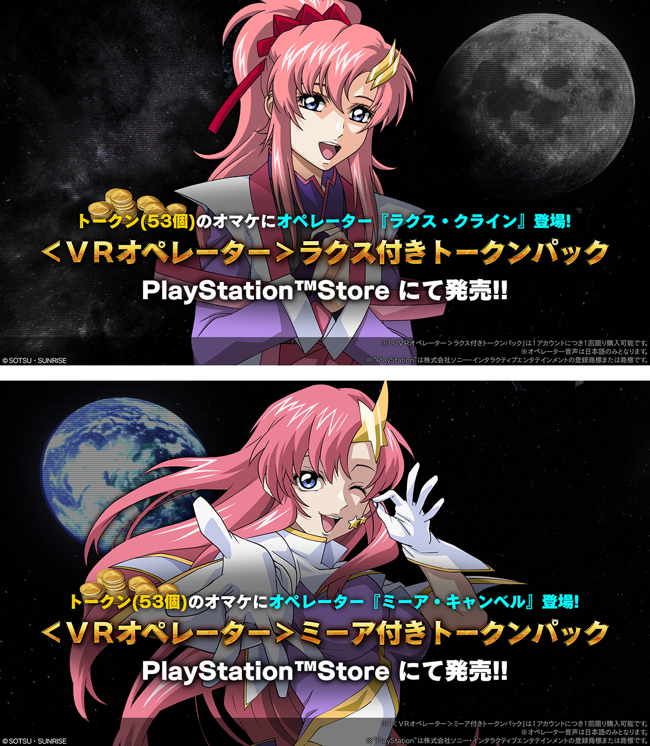 「デスティニーガンダム」の実装と合わせて、「<VRオペレーター>ラクス付きトークンパック」および「<VRオペレーター>ミーア付きトークンパック」を発売いたします。