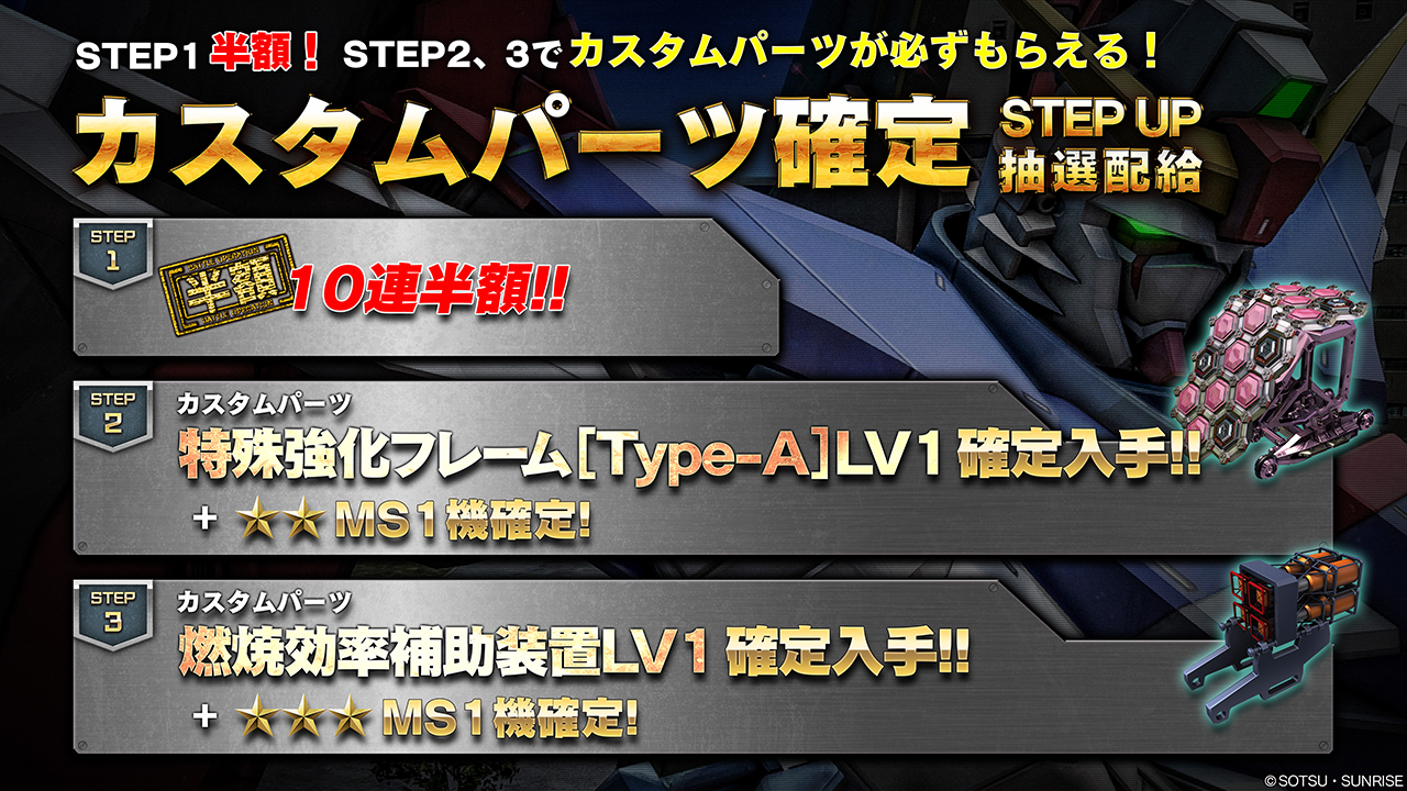 「デスティニーガンダム確定STEP UP抽選配給」ではSTEP7で「デスティニーガンダムLV1」が一機確定で入手可能、デスティニーガンダム向けの「カスタムパーツ確定STEP UP抽選配給」ではデスティニーガンダムとの相性を考慮したカスタムパーツが入手可能となっておりますので、「デスティニーガンダム」が実装するこの機会に、ぜひ合わせてチェックしてください。