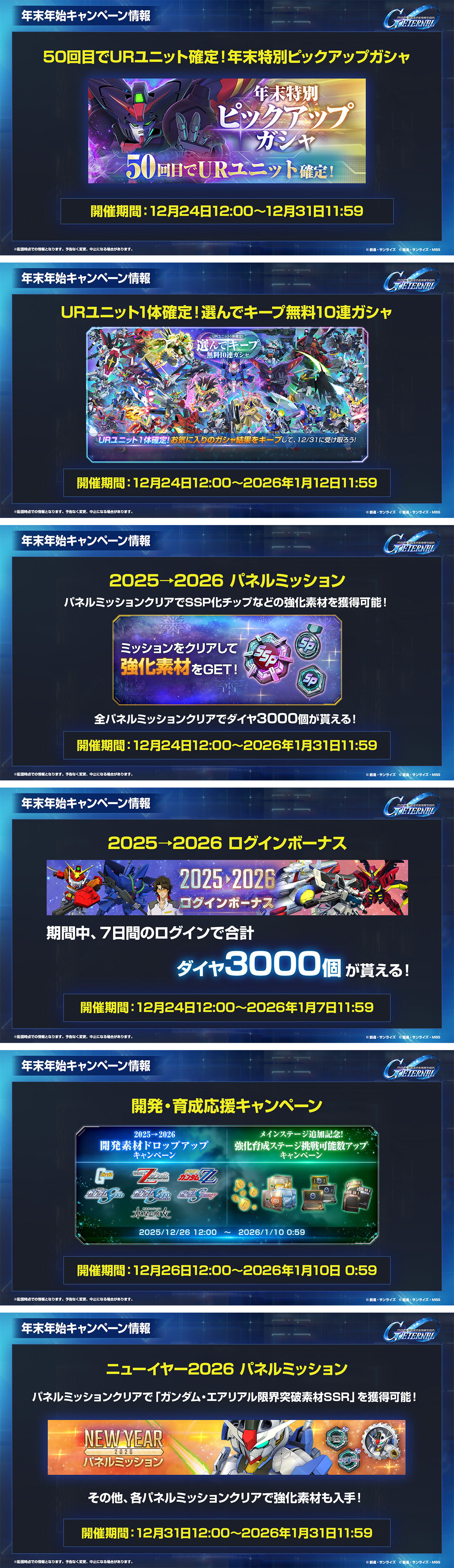 年末年始には、「50回目でURユニット確定!年末特別ピックアップガシャ」、「URユニット1体確定!選んでキープ無料10連ガシャ」、「2025→2026 パネルミッション」、 「2025→2026 ログインボーナス」、「開発・育成応援キャンペーン」、「ニューイヤー2026パネルミッション」が開催予定です。ぜひご参加ください!