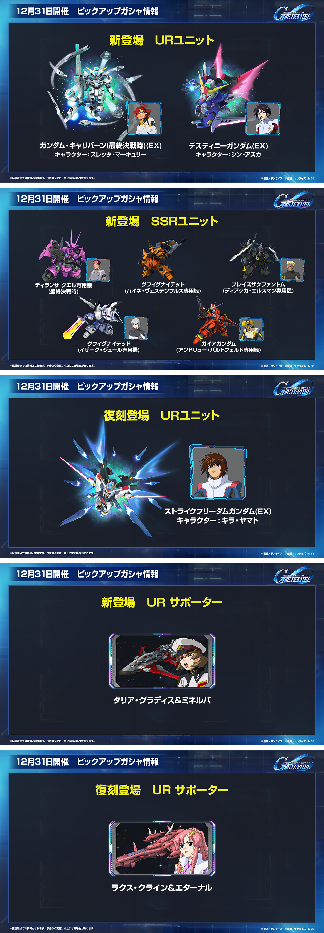 12月31日から開催予定のピックアップガシャには、期間限定ユニットとしてUR「ガンダム・キャリバーン(最終決戦時)(EX)」/UR「スレッタ・マーキュリー」、UR「デスティニーガンダム(EX)」/UR「シン・アスカ」が登場予定です。期間限定サポーターにはUR「タリア・グラディス&ミネルバ」も登場します。また、SSR「ディランザ グエル専用機(最終決戦時)」/SSR「グエル・ジェターク」のほか、SSRユニット、サポーターも多数追加予定です!