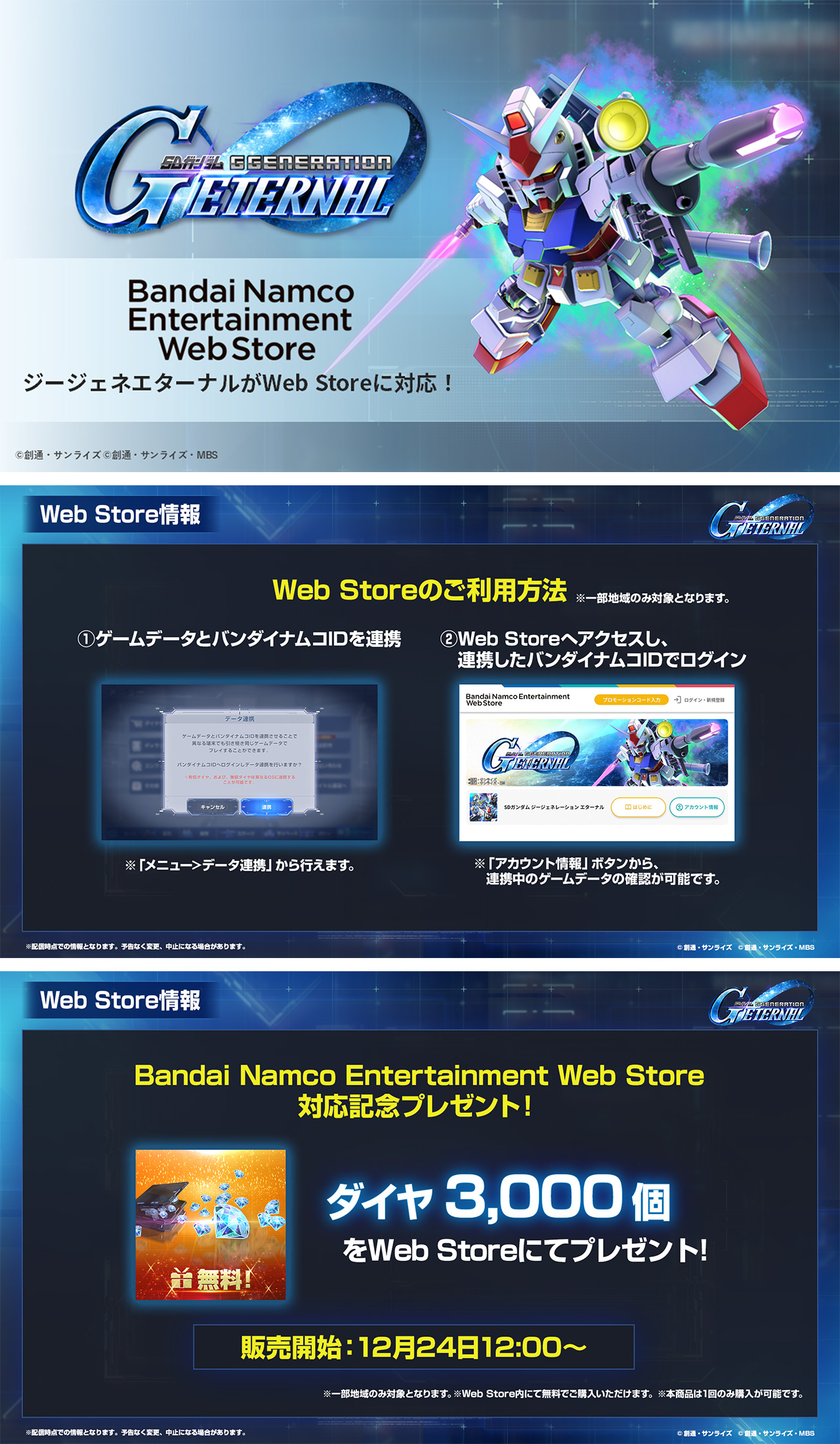 Bandai Namco Entertainment Web Storeにジージェネエターナルが対応いたしました!Web Storeではゲーム内アイテムがお得に購入可能です。