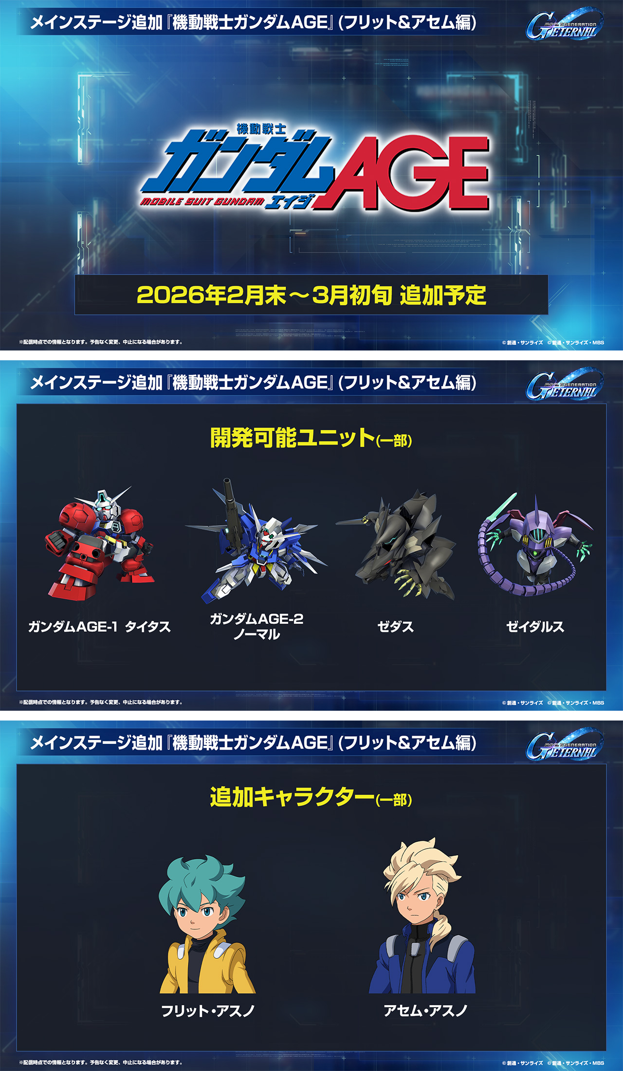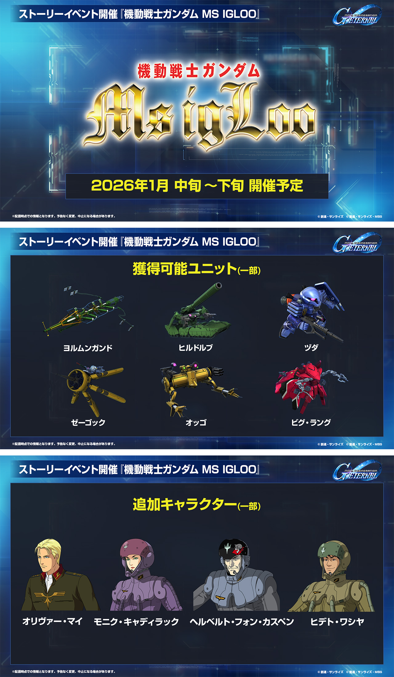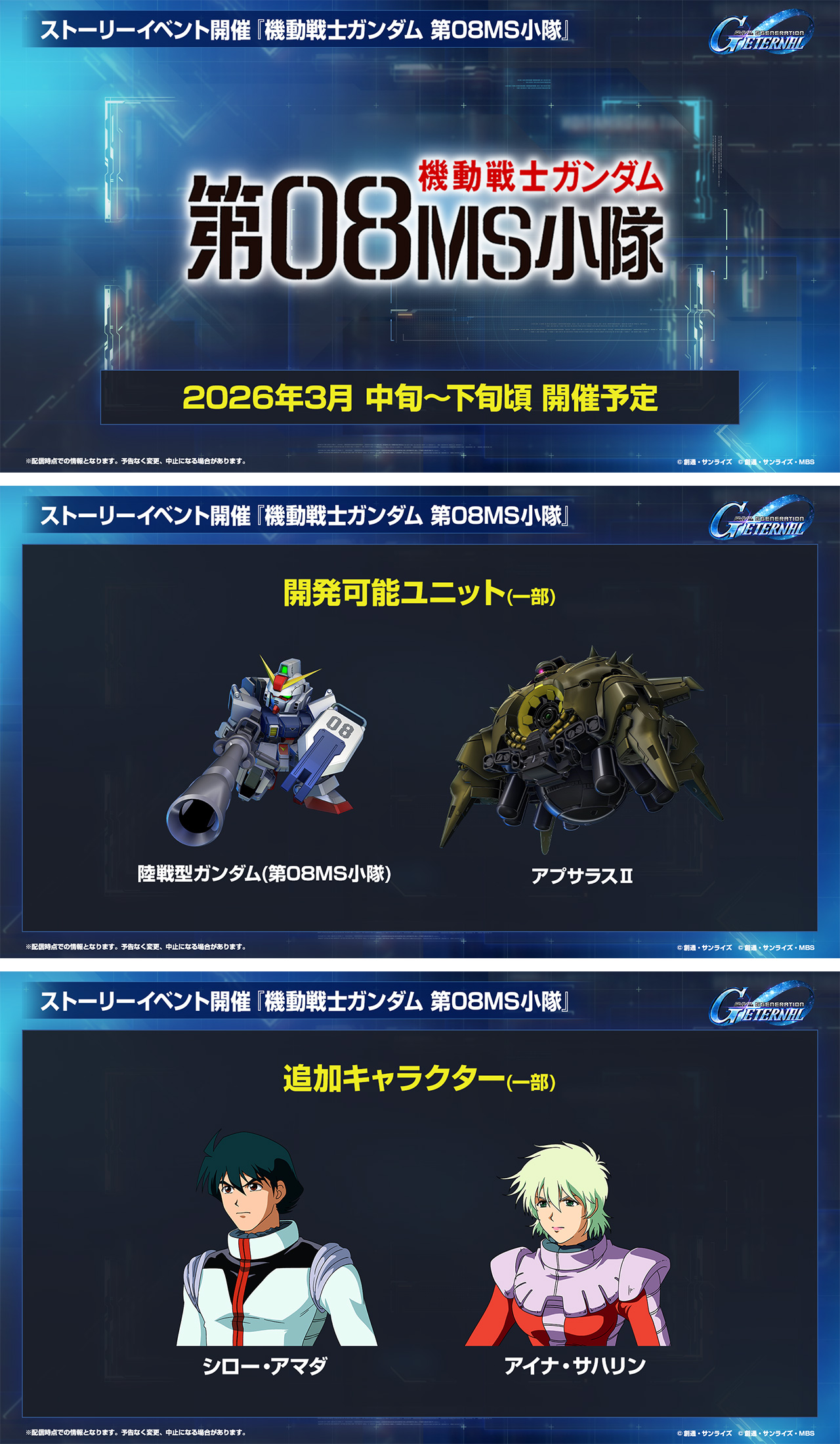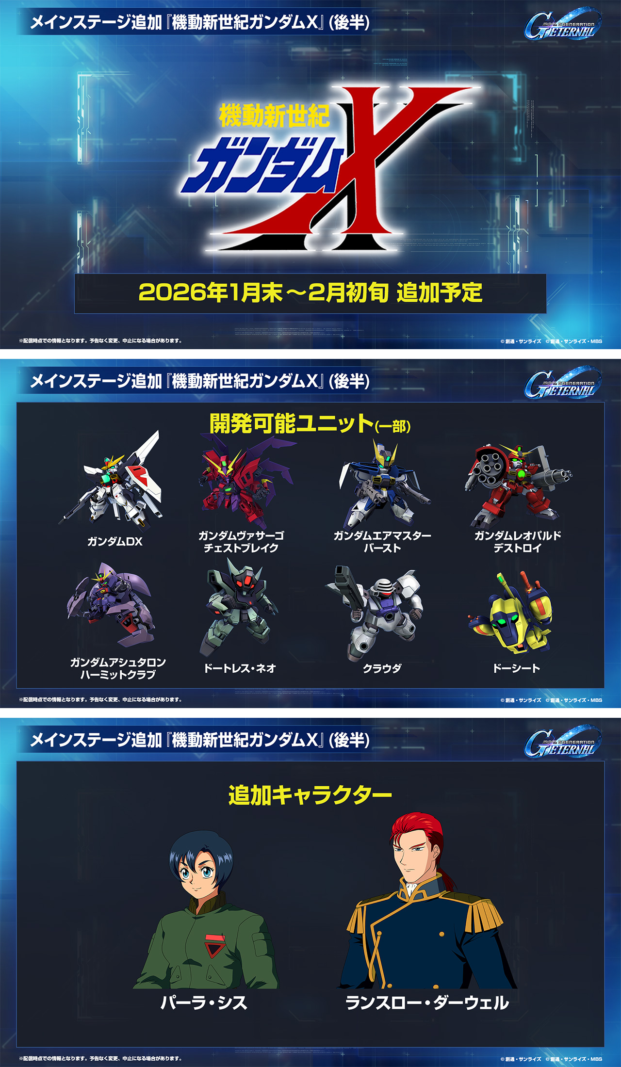 2026年1月にはストーリーイベント「機動戦士ガンダム MS IGLOO」の開催、1月末~2月初旬にはメインステージに「機動新世紀ガンダムX」(後半)の追加!2月以降もストーリーイベント「機動戦士ガンダムSEED X ASTRAY」の開催や、メインステージ「機動戦士ガンダムAGE」(フリット&アセム編)、ストーリーイベント「機動戦士ガンダム 第08MS小隊」の追加を予定しています。