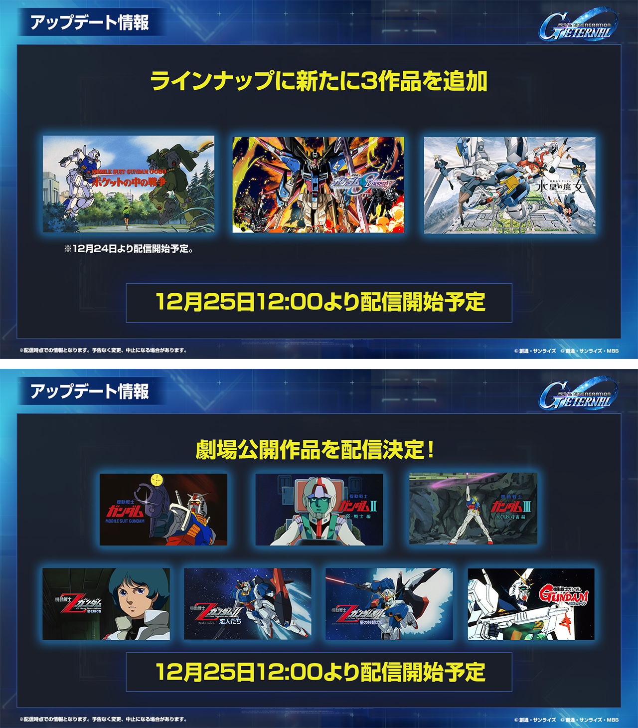 12月31日より、メインステージに「機動戦士ガンダムSEED DESTINY」(後半)と「機動戦士ガンダム 水星の魔女」(後半)が追加される予定です。お楽しみに!