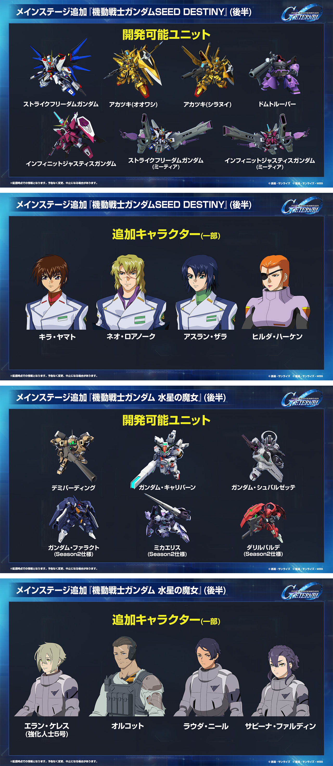 12月23日に配信されました「SDガンダム ジージェネレーション エターナル ロードマップ発表生配信」では、今後のロードマップと新情報をはじめ、さまざまな最新情報を公開しました。メインステージ「機動戦士ガンダムSEED DESTINY」(後半)と「機動戦士ガンダム 水星の魔女」(後半)が12月31日に追加予定