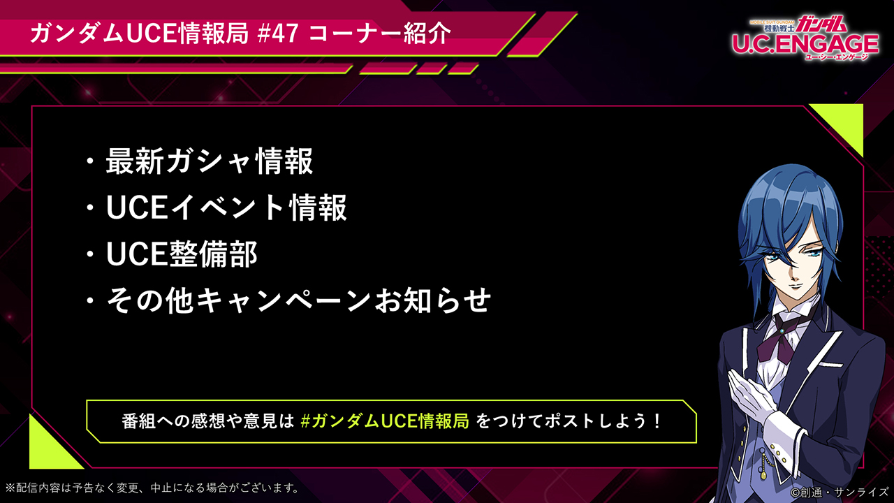 「ガンダムUCE情報局#47」では、ガンダムUCEの運営チームから、ゲーム内の最新情報をお届けする予定です。