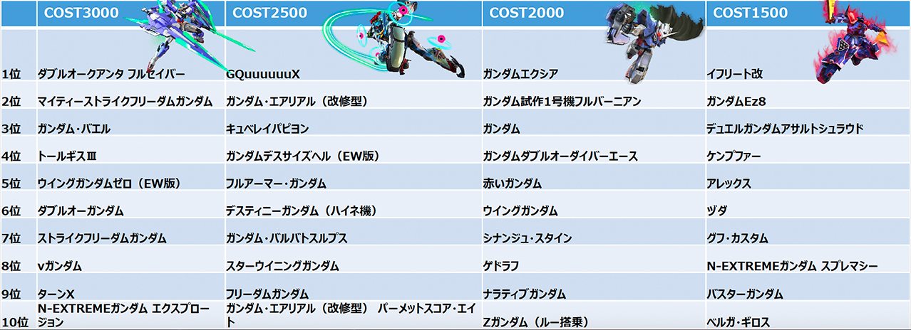 各コスト1位の機体は、