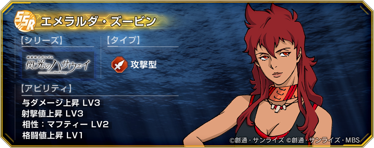 『機動戦士ガンダム 閃光のハサウェイ キルケーの魔女』の公開記念プレゼント第7弾として、SSRキャラクター「エメラルダ・ズービン」とダイヤ300個を配布中!第1弾から第6弾までのプレゼントも配布中ですので、まだ受け取っていないユーザーは、ぜひアプリ内の「プレゼント」からお受け取りください!
