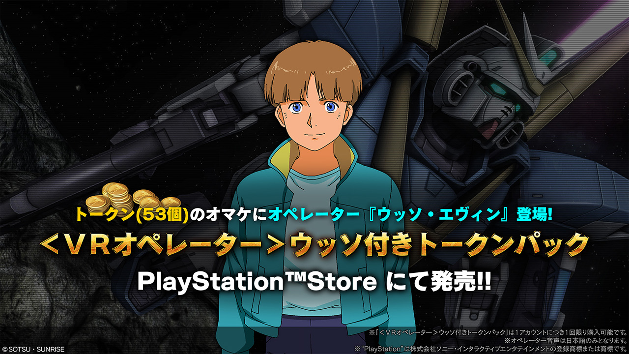 さらに、期間中PlayStation™Storeにてトークン53個に<VRオペレーター>ウッソが付いてくる、<VRオペレーター>ウッソ付きトークンパックを同日より販売決定!「V2ガンダム」とあわせてぜひご購入ください!