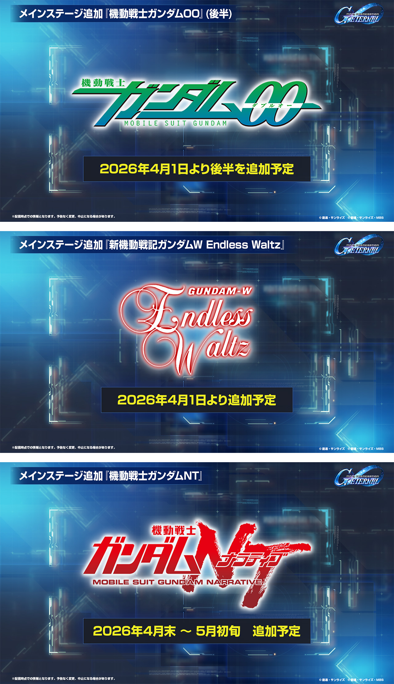 4月1日より『機動戦士ガンダム00』(後半)と『新機動戦記ガンダムW Endless Waltz』がメインステージに追加予定です。また、4月末から5月初旬ごろには『機動戦士ガンダムNT[ナラティブ]』も新たなメインステージとして追加予定です。