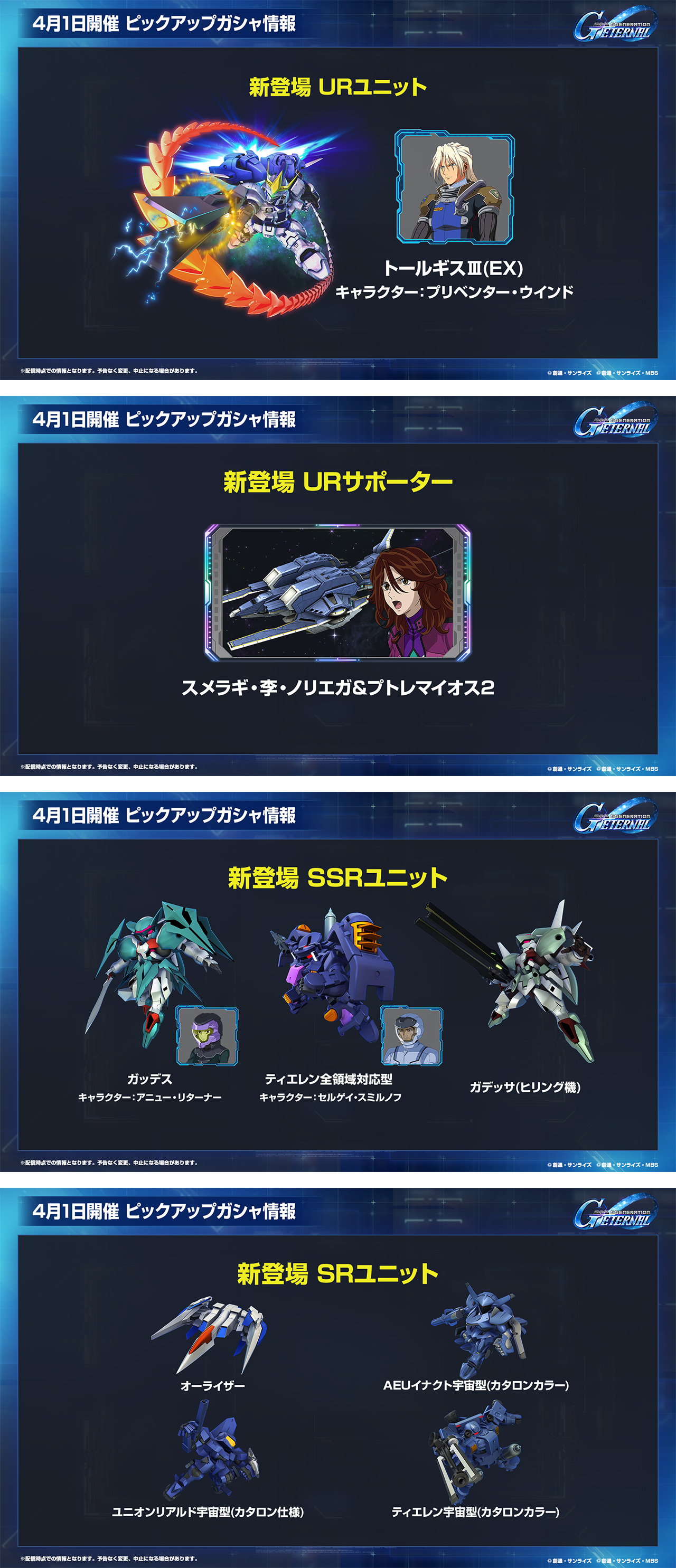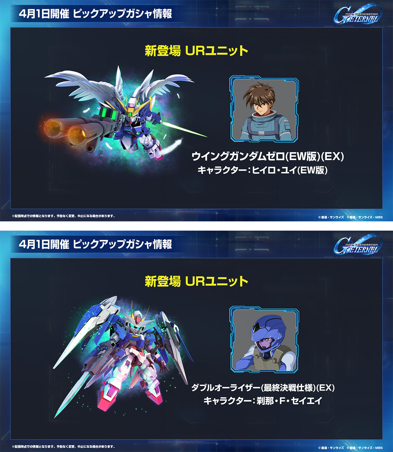 4月1日から開催予定のピックアップガシャには、期間限定ユニットとしてUR「ウイングガンダムゼロ(EW版)(EX)/UR「ヒイロ・ユイ(EW版)」とUR「ダブルオーライザー(最終決戦仕様)(EX)/UR「刹那・F・セイエイ」が登場予定です。さらに、UR「トールギスⅢ(EX)」とUR「プリベンター・ウインド」と、期間限定サポーターとしてUR「スメラギ・李・ノリエガ&プトレマイオス2」も登場します。また、SSR「ガッデス」/SSR「アニュー・リターナー」のほか、SSRユニット、サポーターも多数追加予定です!