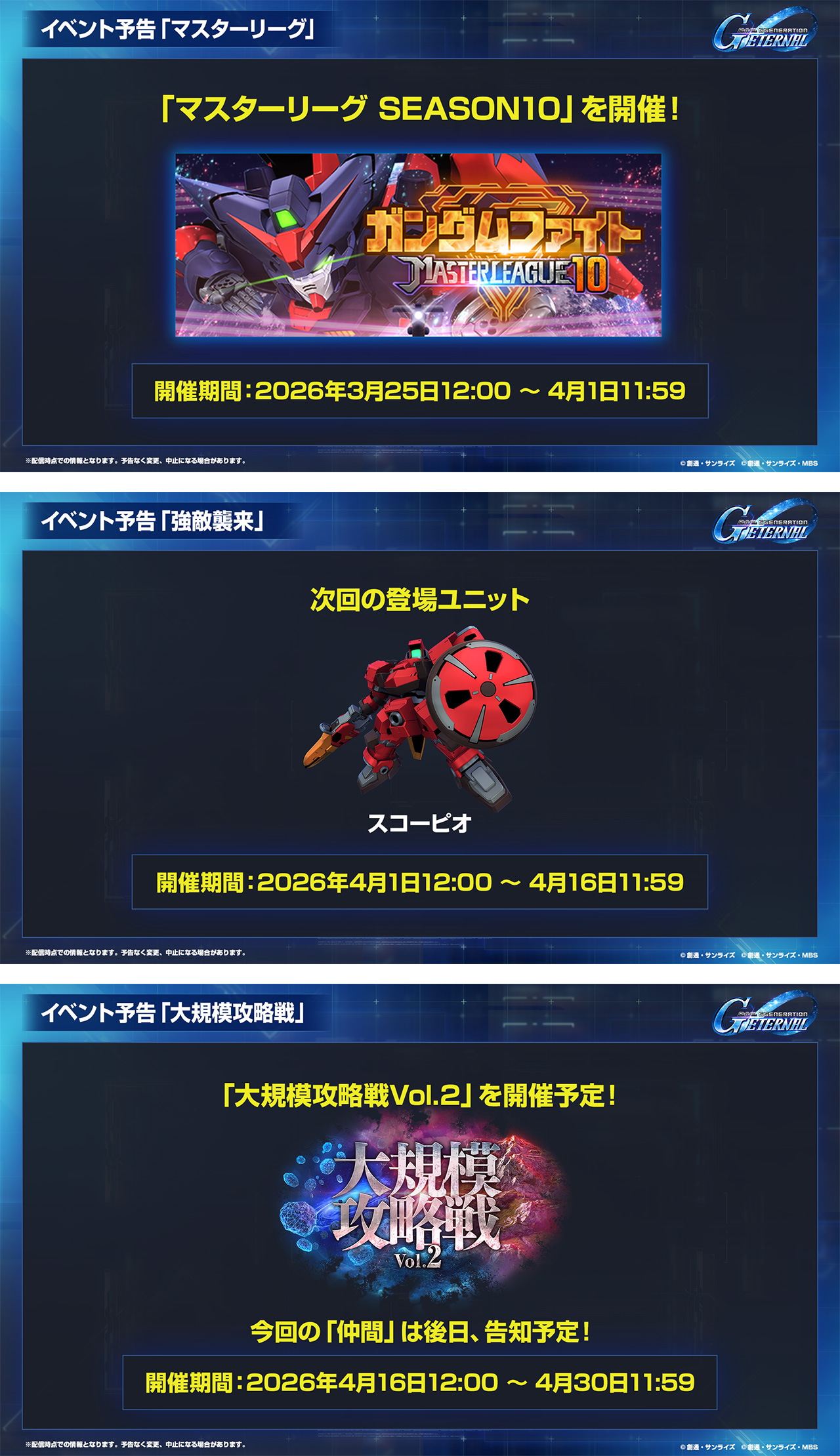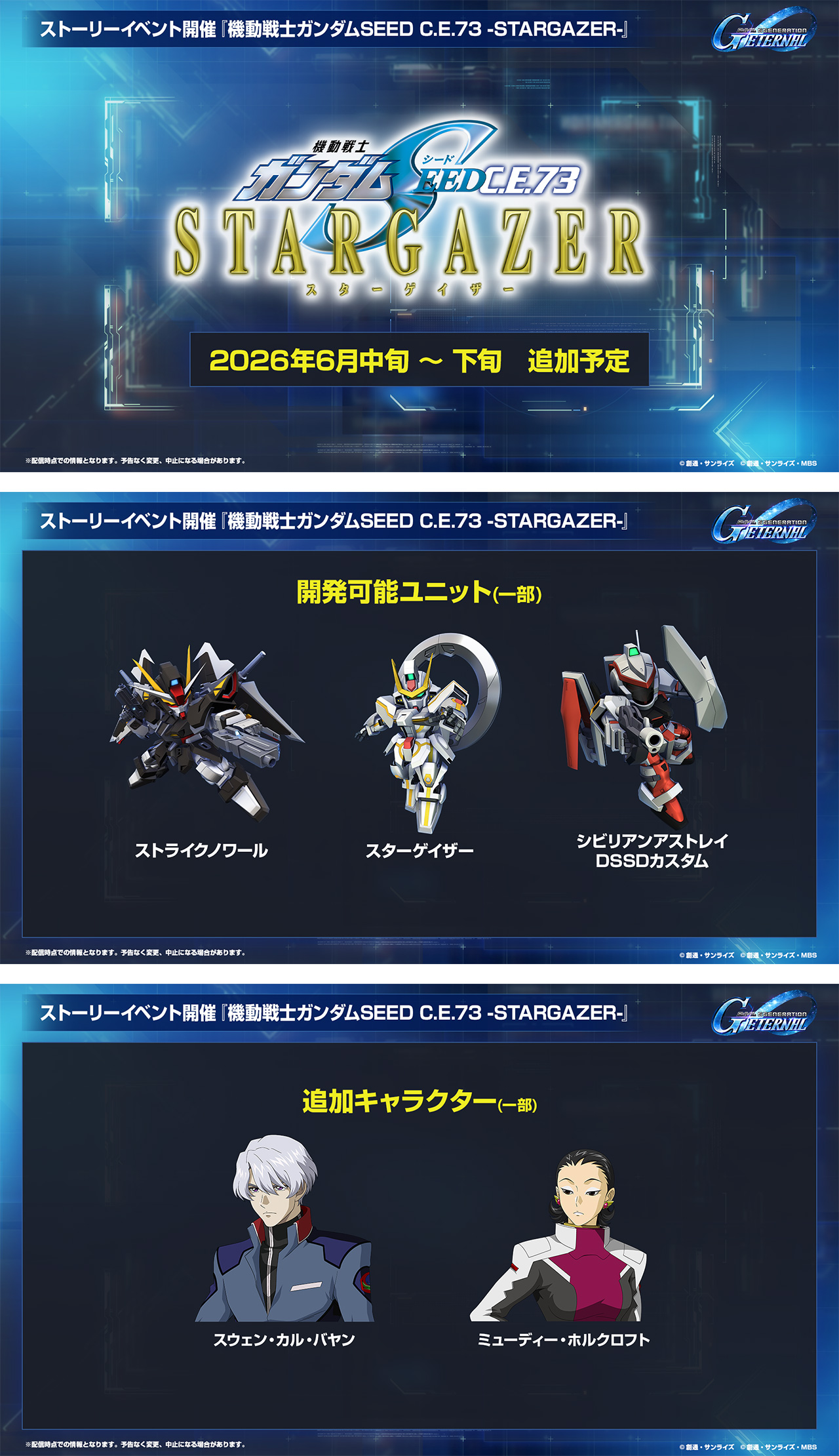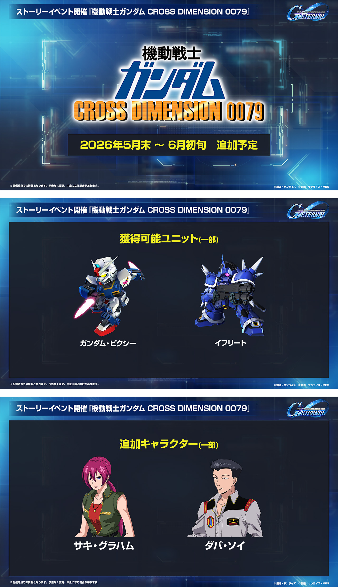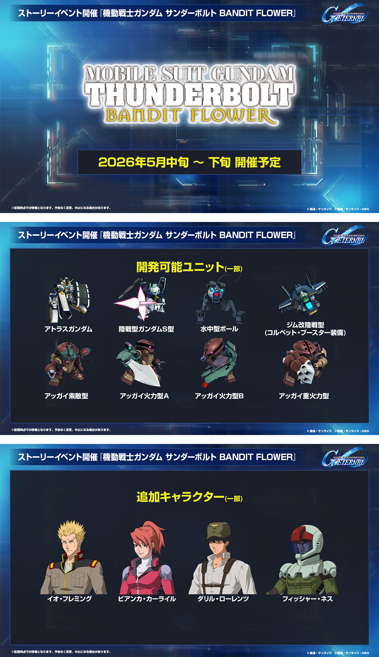 5月中旬〜下旬頃にはストーリーイベント『機動戦士ガンダム サンダーボルト BANDIT FLOWER』、5月末〜6月初旬頃にはストーリーイベント『機動戦士ガンダム CROSS DIMENSION 0079』、6月中旬〜下旬頃にはストーリーイベント『機動戦士ガンダム SEED C.E.73 -STARGAZER-』の開催を予定しています。さらなる続報をお待ちください!