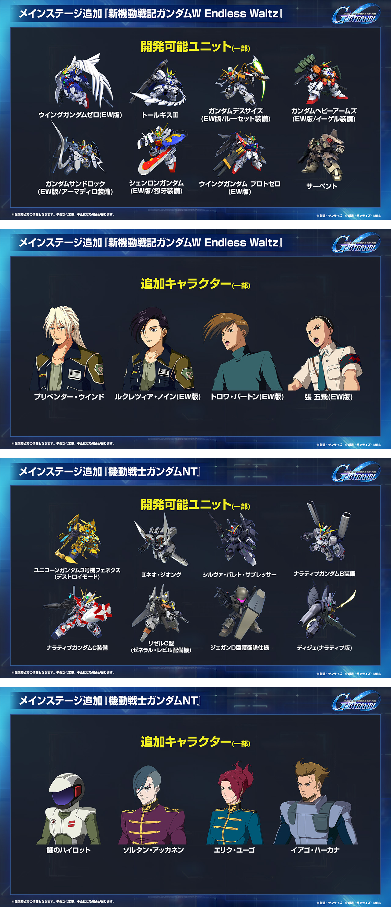 『機動戦士ガンダム00』(後半)、『新機動戦記ガンダムW Endless Waltz』、『機動戦士ガンダムNT[ナラティブ]』がメインステージに追加決定!
