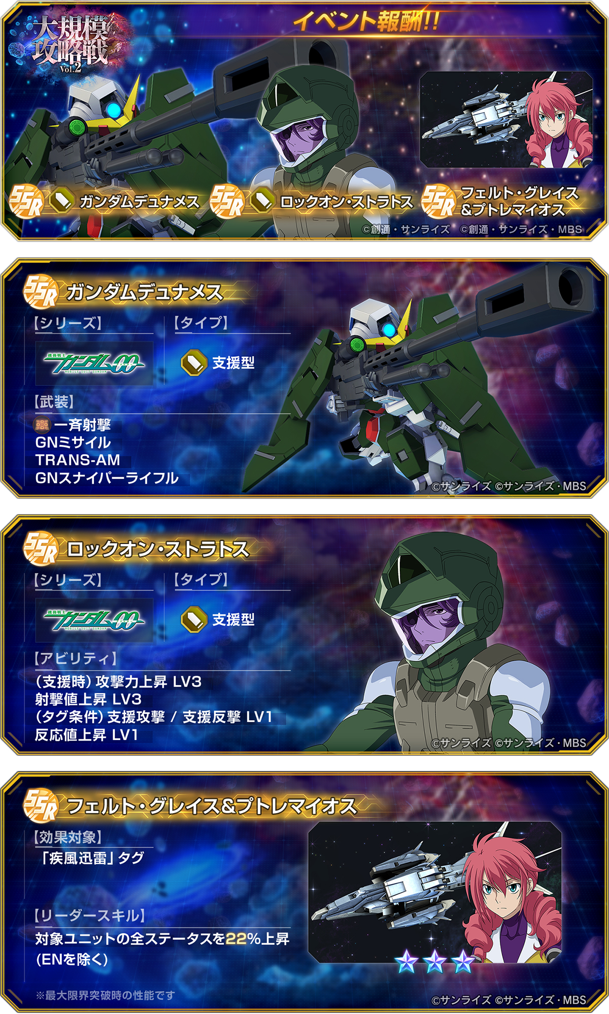 今回は「仲間」として、SSRキャラクター「ロックオン・ストラトス」、SSRユニット「ガンダムデュナメス」、SSRサポーター「フェルト・グレイス&プトレマイオス」がバトルに参加します。イベントを進めることで最大までユニットとサポーターを最大まで限界突破することができ、イベント終了後は強化した状態で獲得することが可能です。