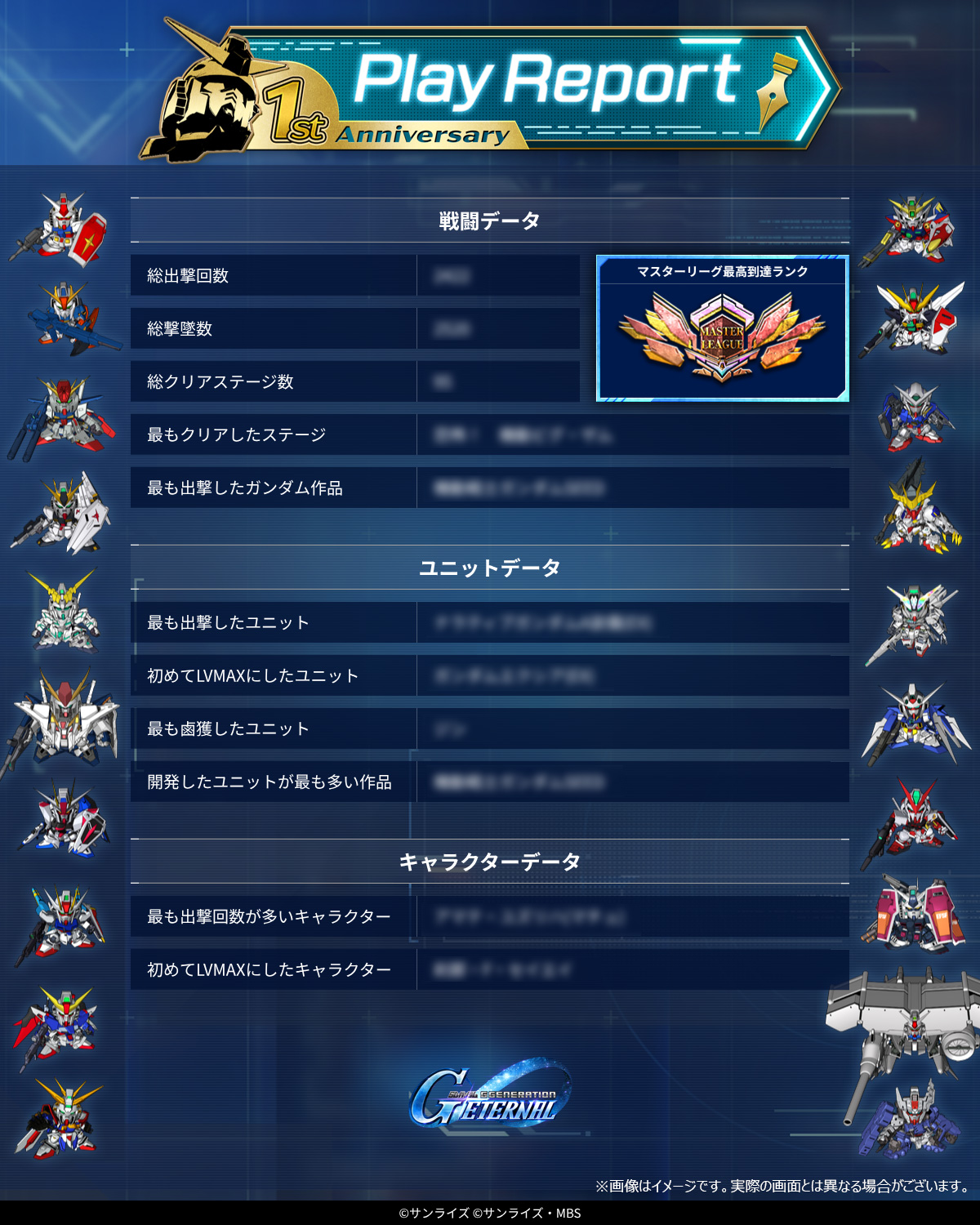 自分のジージェネエターナルの歩みを確認することができる「1st Anniversary PlayReport」を期間限定オープンしました!「最も出撃したユニット」や「最も鹵獲したユニット」などプレイ履歴や戦績などを確認することができます。