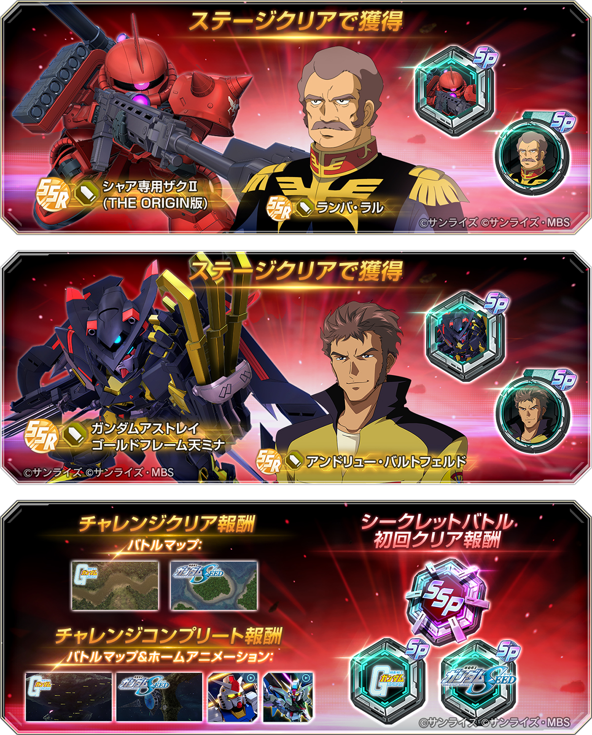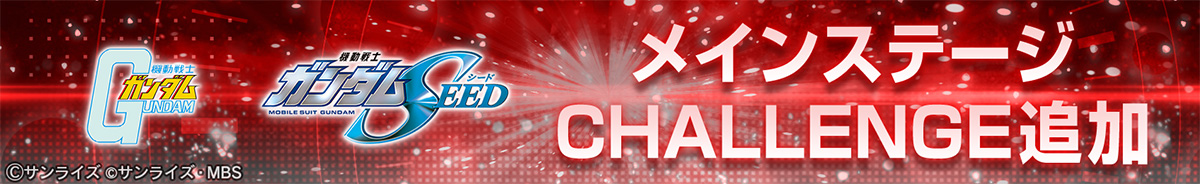 今回「メインステージCHALLENGE」が追加される作品は「機動戦士ガンダム」と「機動戦士ガンダムSEED」で、挑戦可能な作品は今後のアップデートで追加される予定です。